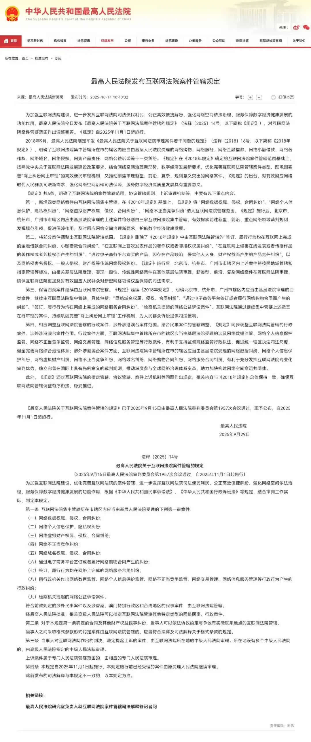 具体为《最高人民法院关于互联网法院案件管辖的规定》(法释【2025】14号),该规定较长原文我贴在最后,有兴趣的朋友可以自行查看。