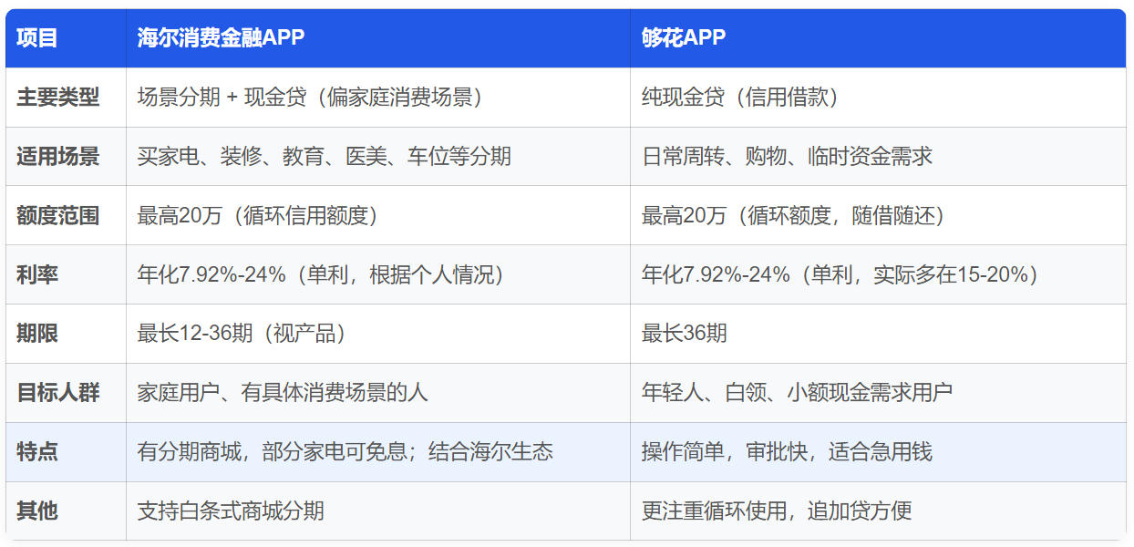 简单说,海尔消费金融公司主打两种业务:场景分期(比如买家电、装修、教育等分期付款)和纯现金贷。海尔消费金融APP更侧重一站式家庭场景服务,而够花APP则主要是面向年轻人的纯信用现金借款,操作更简单直接。额度基本共享,用一个APP借了,另一个可能就受影响。