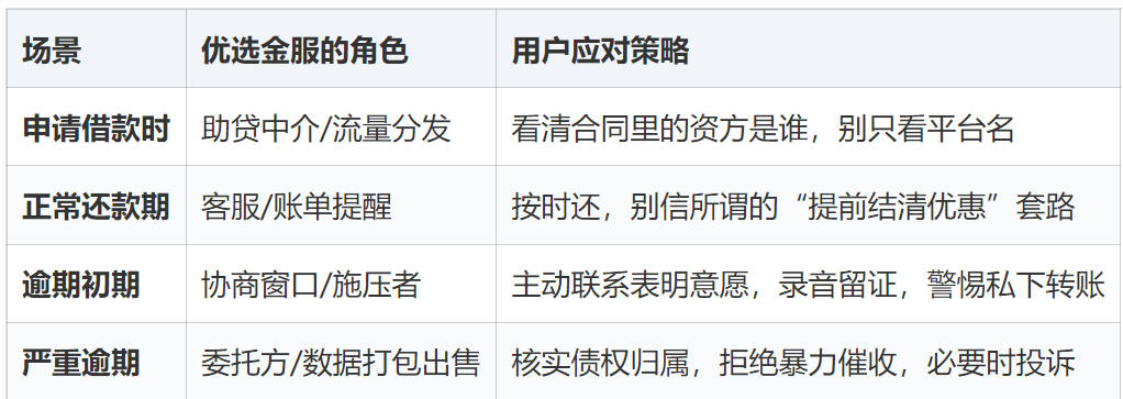 这时候它的身份就复杂了。它既不是纯粹的催收公司,也不是单纯的协商机构,而是两头吃。对于还想还款但暂时困难的,它能提供债务重组、延期方案,帮你跟资方谈;但对于那些“失联”或者明确不还的,它委托的第三方催收团队下手可就不轻了。很多老哥反馈,电话显示“优选金服”,语气却像专业催收,其实就是因为他们把贷后管理外包出去了,或者内部团队直接转岗干催收。
