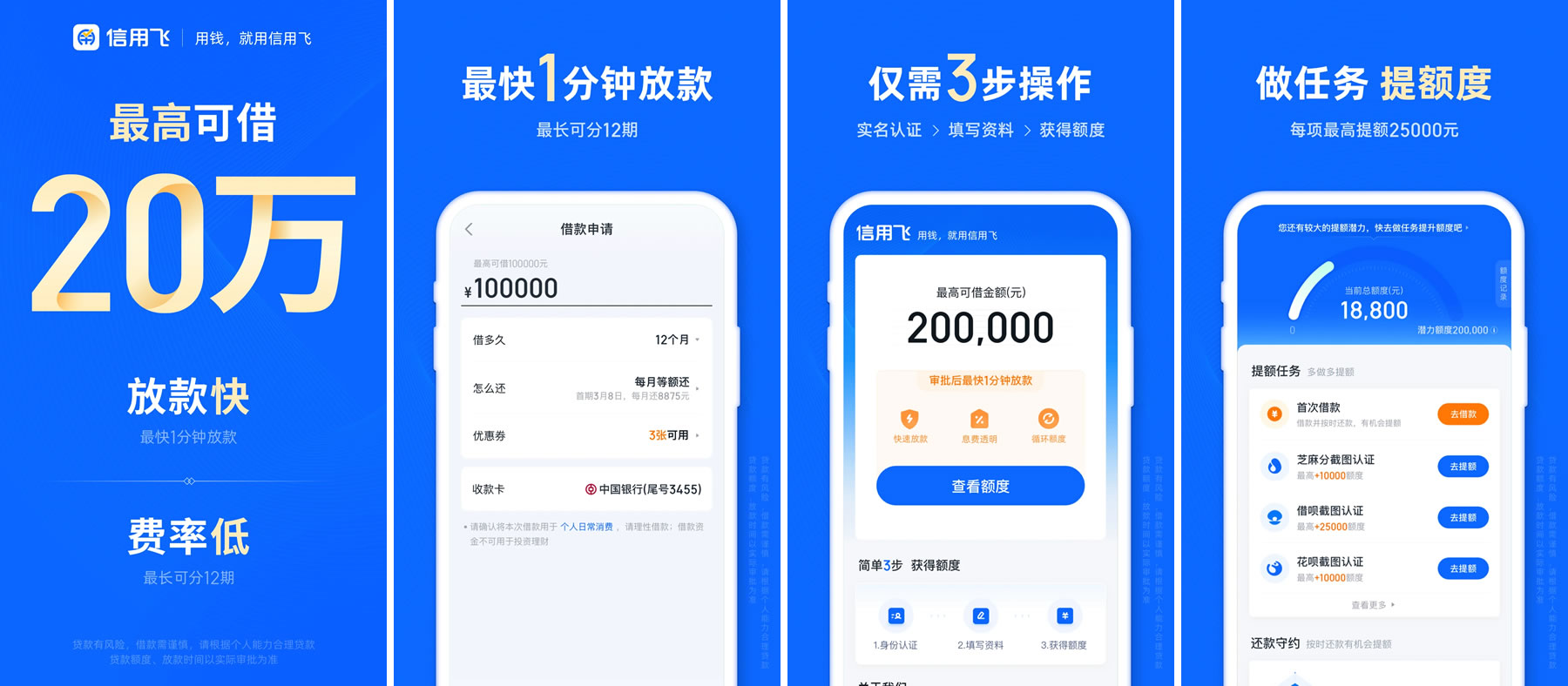 信用飞,是(上海晓途网络科技有限公司)推出的一款个人消费贷款产品。信用飞深耕航旅生态和消费金融场景,基于大数据信用管理让更多用户享受更优质的金融科技服务。
