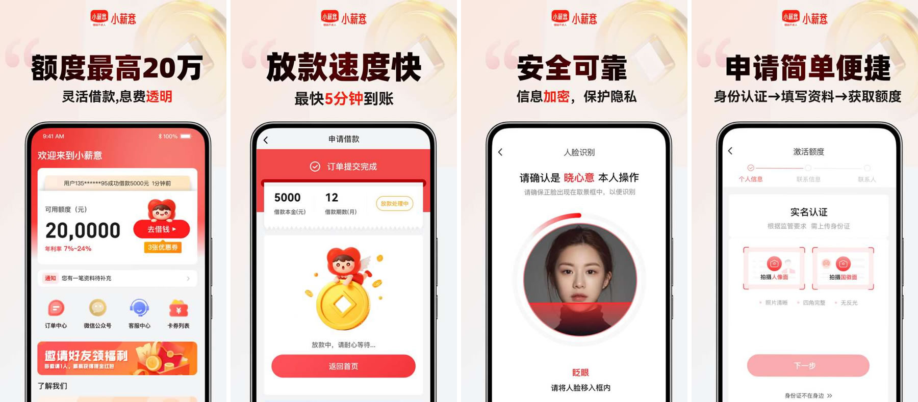 小薪意,是微普信(全称:深圳微普信科技有限公司)旗下的一款纯线上信用贷款产品,专注为个人和小微企业主提供即时到账的资金服务。基于成熟专业的风控能力对客户信用进行整体评估,3步借款,上限高达20万,平均5秒以内放款。主打纯信用贷款,用户凭身份证即可申请,最长分期12个月。