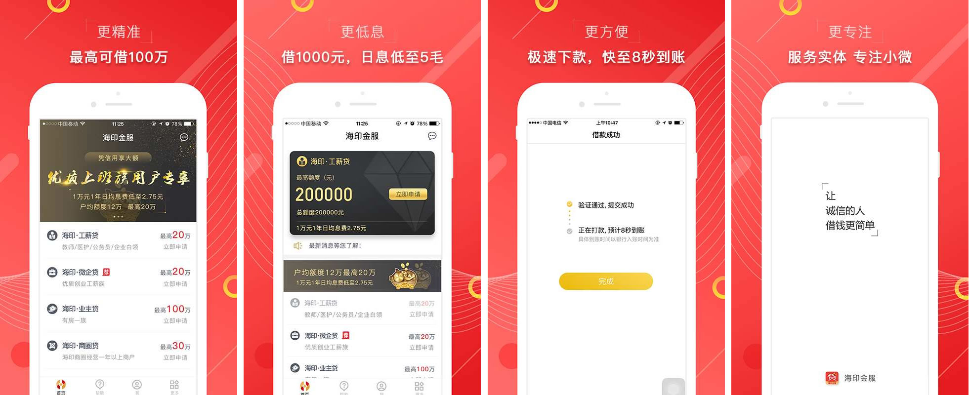海印金服,是(广州海印互联网小额贷款有限公司)维护的消费贷款平台,平台以服务小微客户为出发点,依托大数据风控体系,科技驱动金融,为客户提供合规、安全、便捷的普惠金融贷款服务。