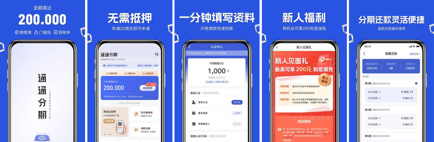 通通分期app是宁夏海胜通互联网小额贷款有限公司提供的一款信贷产品,通通分期团队利用人工智能和大数据风控技术,为用户提供方便、快捷、安全的借款服务。凭身份证+手机,即可快速申请借款。快速借款,APP线上申请无需面签和抵押。无论是应急借贷、旅游购物、教育培训、小额消费分期等,通通分期为你提供一站式借贷服务,快速、便捷、安全,降低金融交易成本,为用户提供方便、快捷、安全的借款服务。