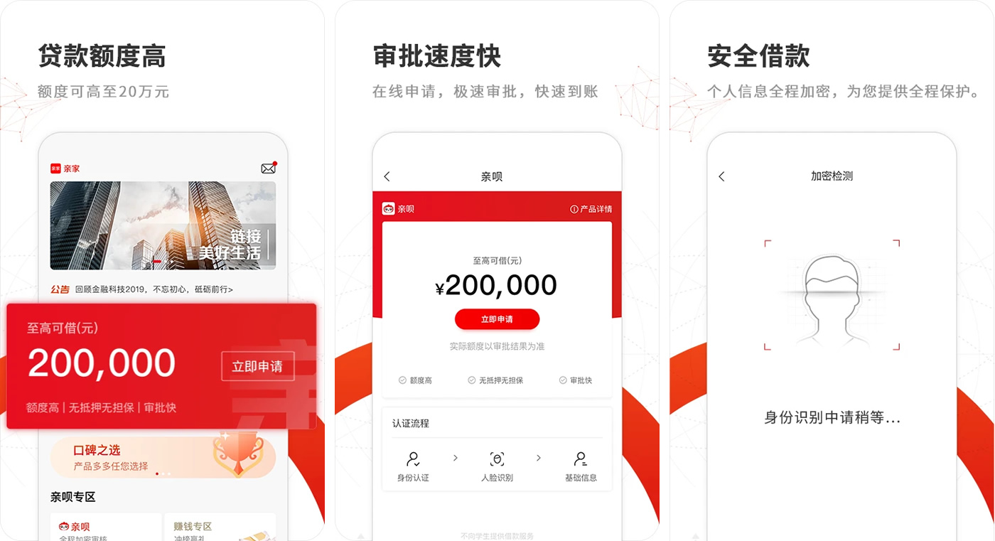 亲呗”是亲家控股(全称:亲家投资控股有限公司)推出的信贷服务品牌,利用人工智能和大数据风控技术,为用户提供方便、快捷、安心的借款服务。在线申请,极速审批,快速到账。息费透明、还款灵活:贷款日息0.02%起,支持多种还款途径。