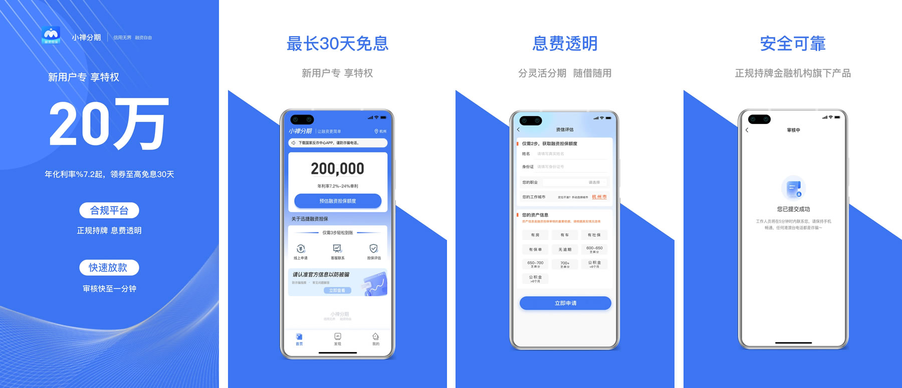 小禅分期,是(广东捷迅融资担保有限公司)提供的一款信贷产品,为用户提供大数据技术支持,通过算法精准匹配贷款方案,真正实现 “一人一方案” 的个性化定制,为您量身打造适配需求的服务。