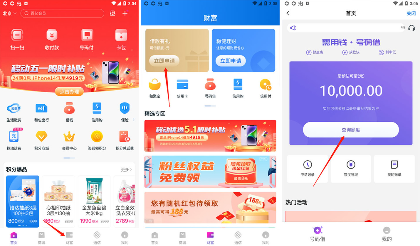 和包借款,是由(中国移动通信集团有限公司)推出的一款官方数字生活服务应用,其总体功能相当的强大,包括了:移动支付、生活缴费、信用购机、金融借贷等服务。有了和包借款app之后你便可以随时在软件内进行借款,使用人数不在少数,不管你是黑户还是白户,只要你提供自己的身份证信息就可以啦,多种额度区间可以随时,直到借到让大家满意为止,直接在线解决你急用钱的难题。除此之外,你还可以在中国移动积分商城购买商品和服务,在带给用户随时随地随身的移动支付体验的同时,还可以确保用户交易的安全性和便捷性,需要的用户快来下载体验吧。
